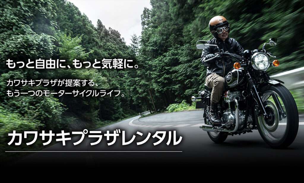 | 特徴 | 全車両がカワサキ車。 カワサキ正規ディーラー「カワサキプラザ」による高品質なサービスと車両整備が特徴。 購入前のじっくりとした試乗利用を推奨。 |