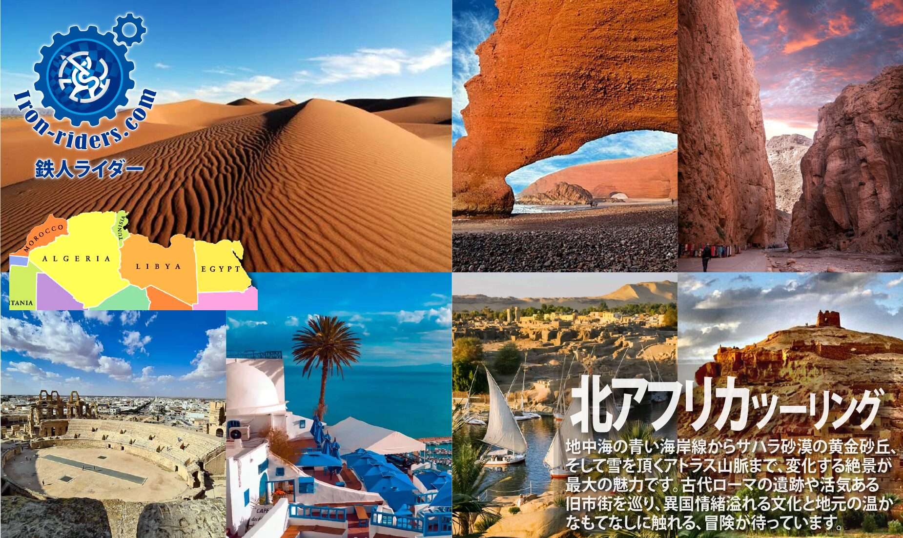 北アフリカ(エジプト・リビア・チュニジア・アルジェリア・モロッコなど)でのツーリングは、地中海の青い海岸線からサハラ砂漠の黄金の砂丘、そして雪を頂くアトラス山脈まで、劇的に変化する絶景が最大の魅力です。