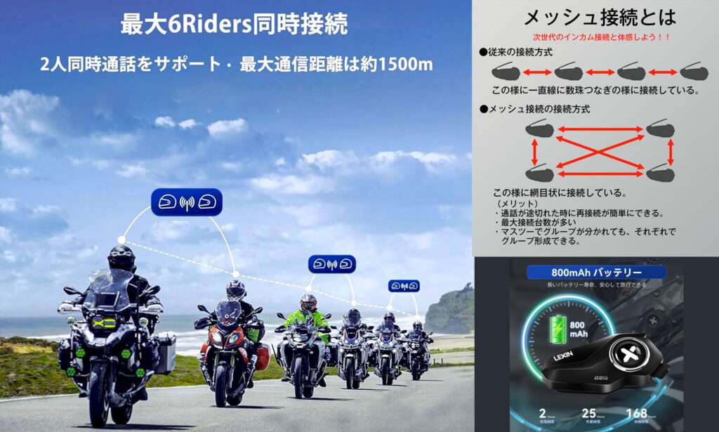 • 長距離通信: Bluetoothインカムよりも通信距離が長く、隊列が多少離れても連絡が途切れにくいです。
