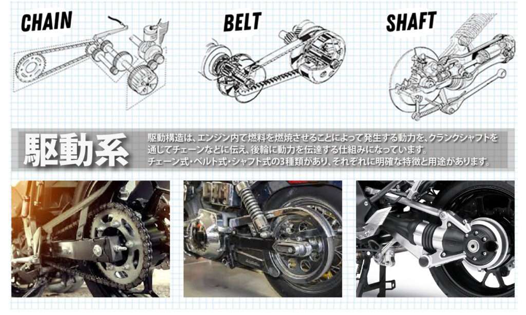 6.耐久性:シャフト駆動が最も耐久性に優れ、ツアラーや大型バイクに採用されることが多い。