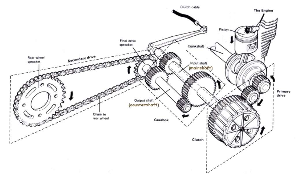• 動力の伝達と遮断 エンジンからの回転力を後輪に伝えるか、遮断するかを制御します。発進・停止・ギアチェンジ時に不可欠です。