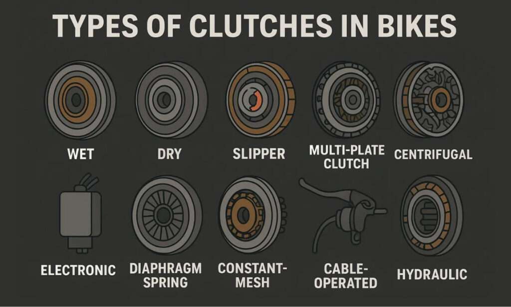 湿式多板クラッチエンジンオイルに浸されており、冷却性・耐久性が高く、一般的なバイクに多く採用される。