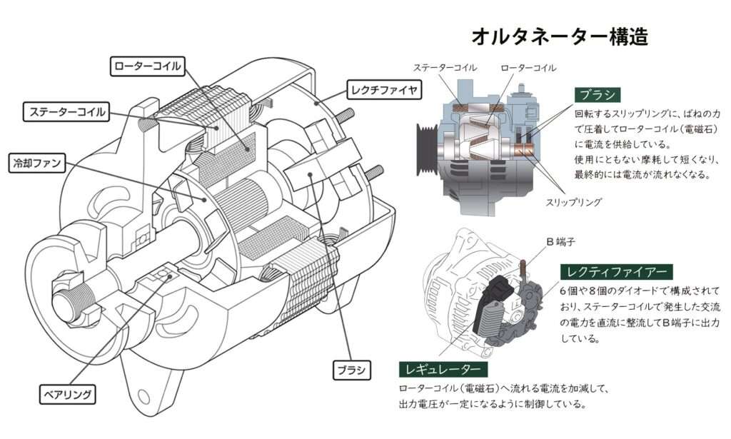 オルタネーターはエンジン回転中に発電を行い、バッテリーの充電や走行中の電装品への電力供給を行います。
