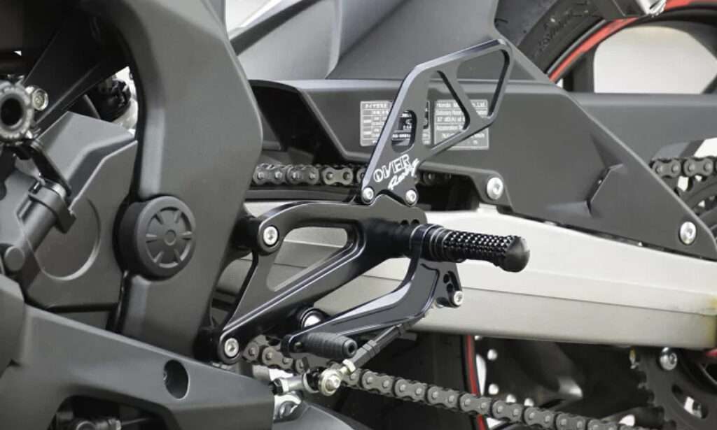 バックステップ純正より後方・上方に配置。調整式が多いスポーツ走行、前傾姿勢、バンク角確保
