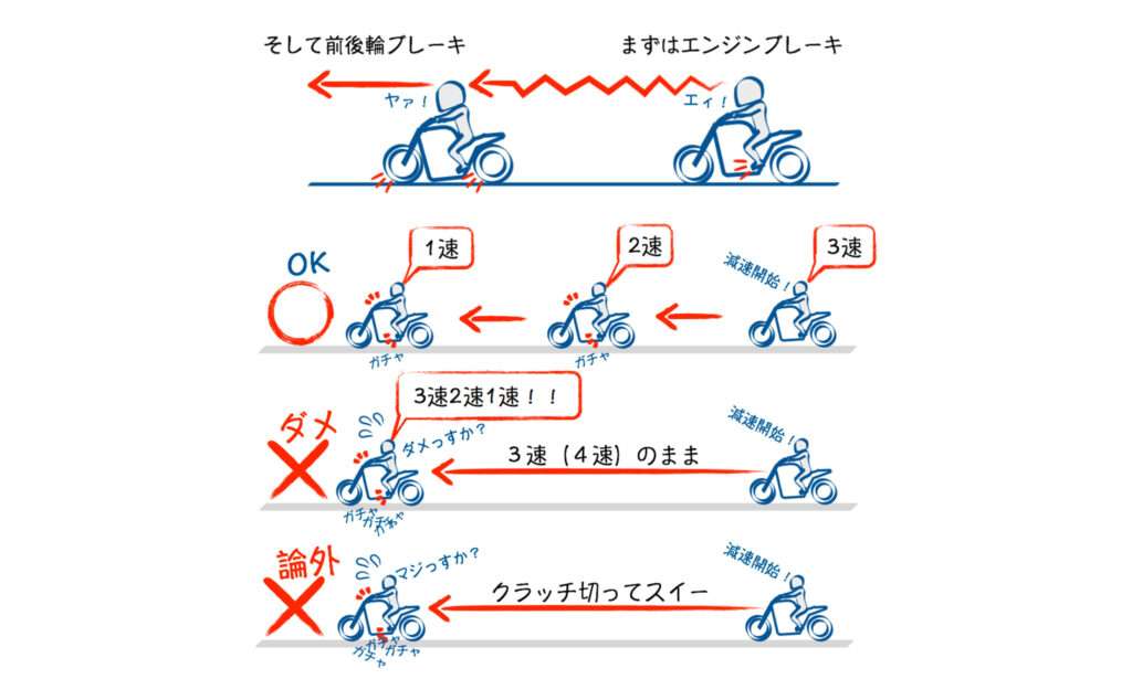 • ギアダウン → エンジン回転数上昇 → 制動力増加