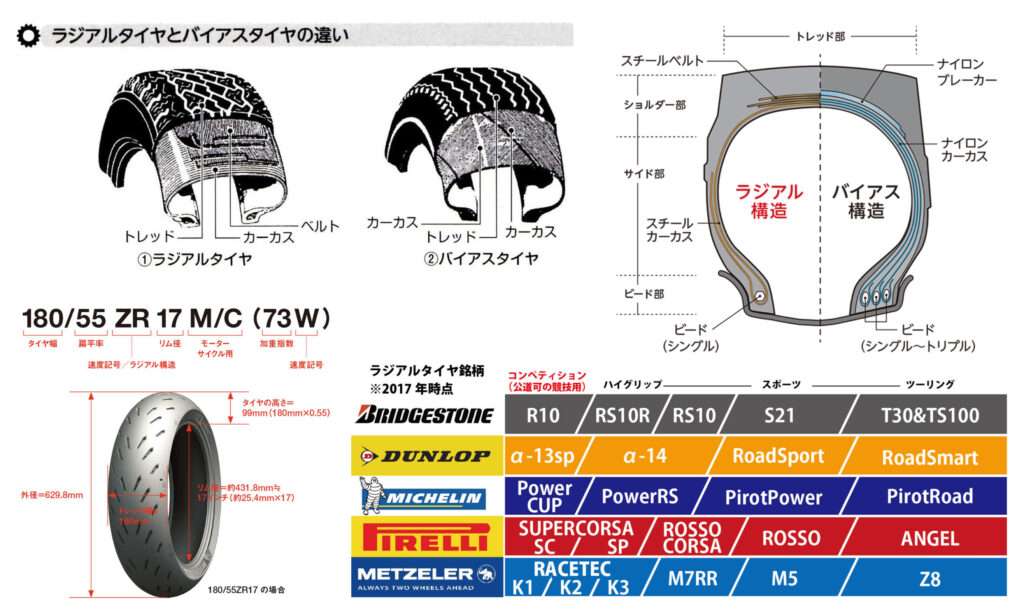 ラジアルタイヤカーカスが放射状に配置高速安定性とグリップに優れる。価格は高め