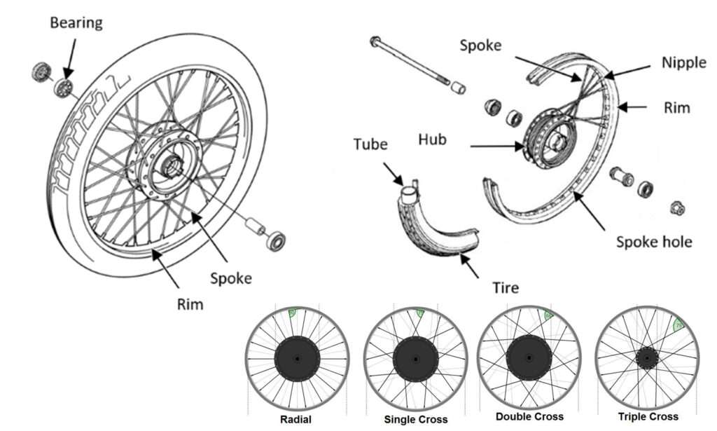 - ラジアル組:スポークが交差せず、ハブから放射状にリムへ接続。軽量だがトルク伝達には不向き。